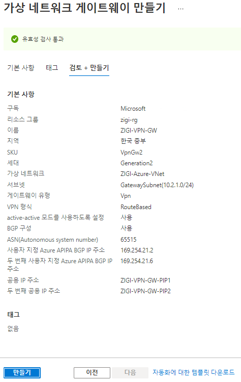 모든 설정이 끝나고 나면, 현재 설정한 값을 검토 후에 '만들기' 버튼을 클릭해서 가상 네트워크 게이트웨이를 생성합니다.