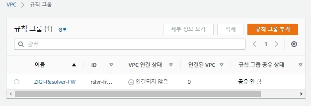 현재 규칙 그룹을 만들기만 하고, VPC에 연결하지 않았기 때문에