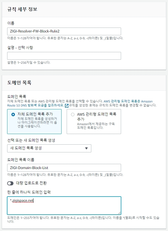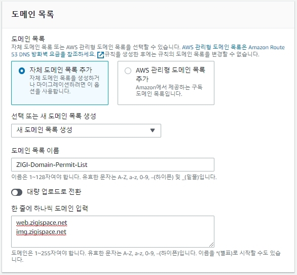 도메인 목록은 자체 도메인 목록 추가와 AWS 관리형 도메인 목록이 있습니다.