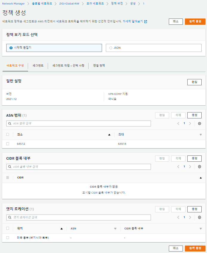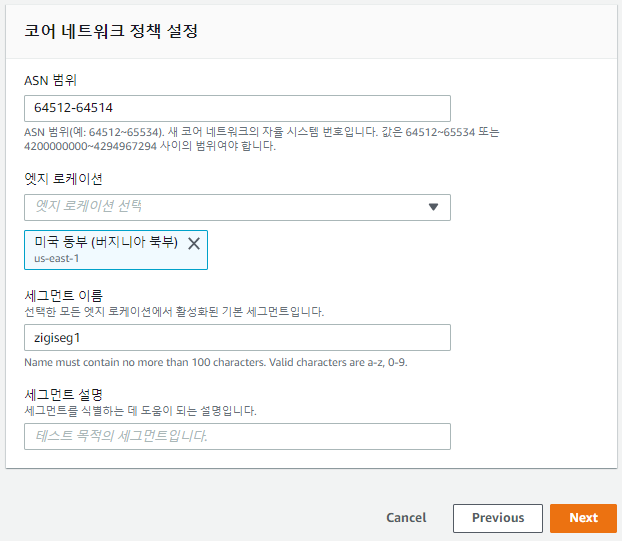 추가로 코어 네트워크에서 사용할 ASN 범위와 엣지 로케이션, 세그먼트를 입력합니다.