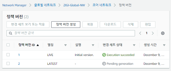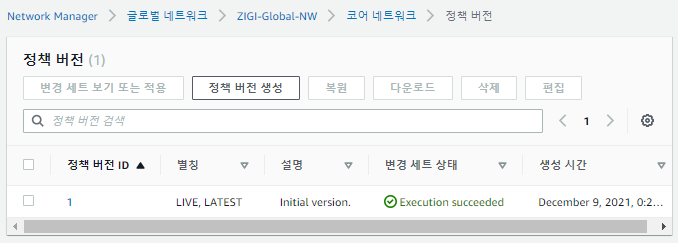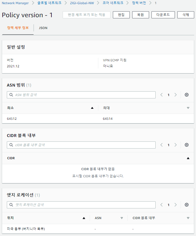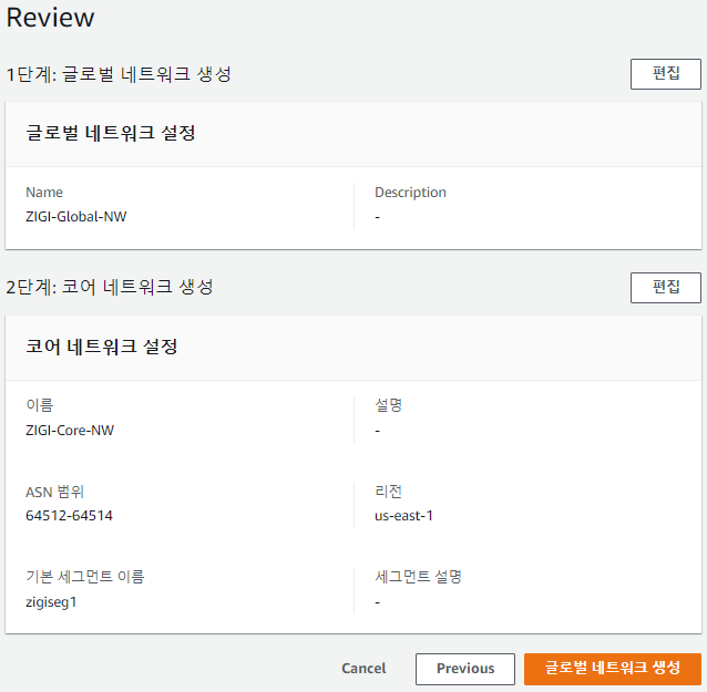 코어 네트워크 설정 후에 글로벌 네트워크를 만들기 위해서 설정한 값을 확인하고 글로벌 네트워크를 생성합니다.
