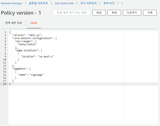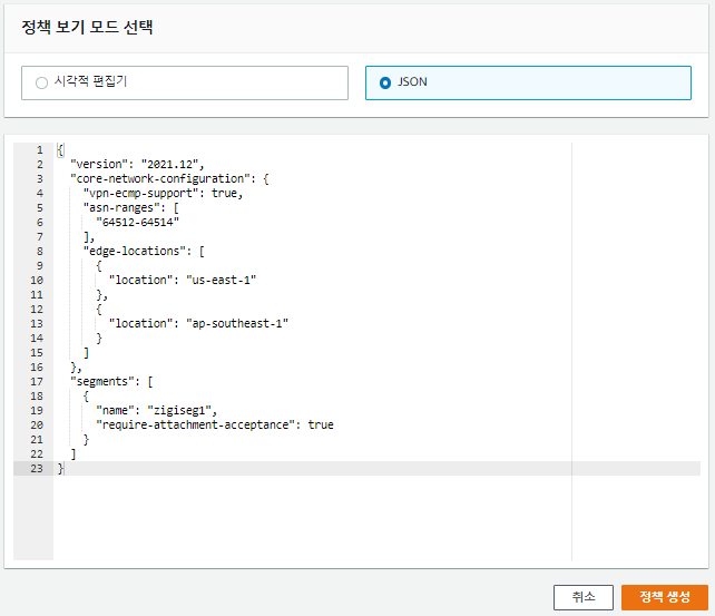 앞서 코어 네트워크 생성 시에 입력한 항목이 코어 네트워크 정책 문서를 만들기 위한 값이었습니다.