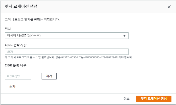 엣지 로케이션(Edge location)은 코어 영역에 속한 리전으로 코어 네트워크에서 관리하게 될 리전을 선택합니다.
