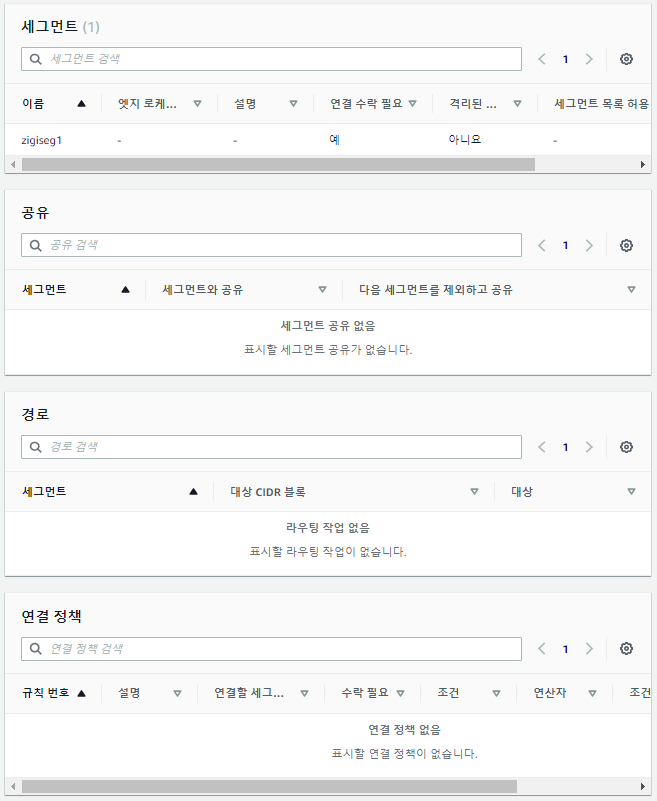 현재 코어 네트워크에서는 엣지 로케이션(초기 설정한 버지니아 리전)과 기본 세그먼트가 1개씩 있는 것을 볼 수 있습니다.