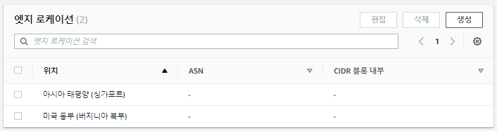 us-east-1(버지니아 리전)과 ap-southeast-1(싱가포르 리전) 2개의 엣지 로케이션이 있는 것을 볼 수 있습니다.