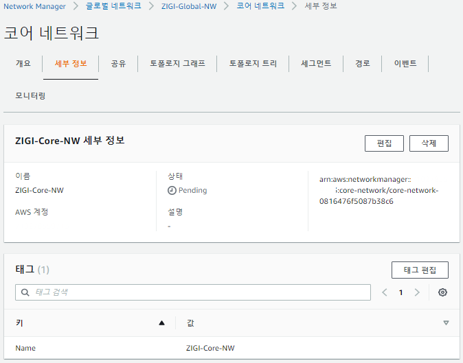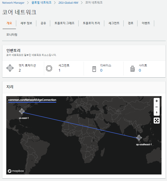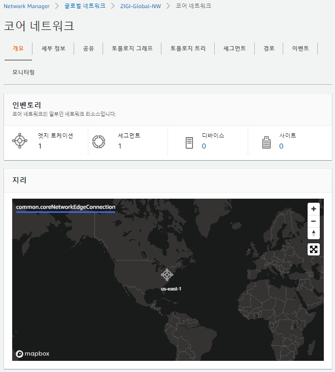 현재 코어 네트워크에서는 엣지 로케이션(초기 설정한 버지니아 리전)과 기본 세그먼트가 1개씩 있는 것을 볼 수 있습니다.