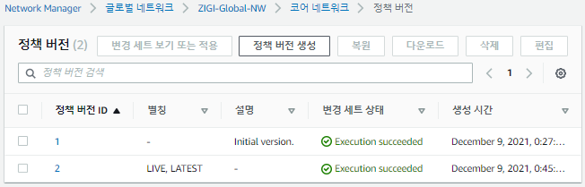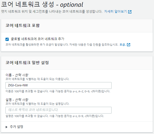 코어 네트워크 설정 후에 글로벌 네트워크를 만들기 위해서 설정한 값을 확인하고 글로벌 네트워크를 생성합니다.