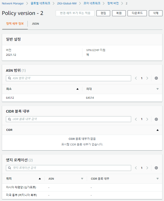에지 로케이션에 싱가포르 리전을 추가하였기 때문에 Core Network edge가 Add되는 것을 볼 수 있습니다.