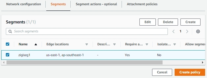 다음은 Attachments가 Segments에 연결되기 위한 Policy(정책)을 설정합니다.