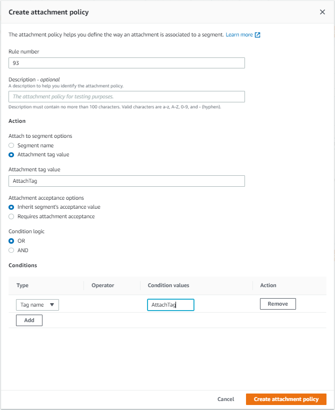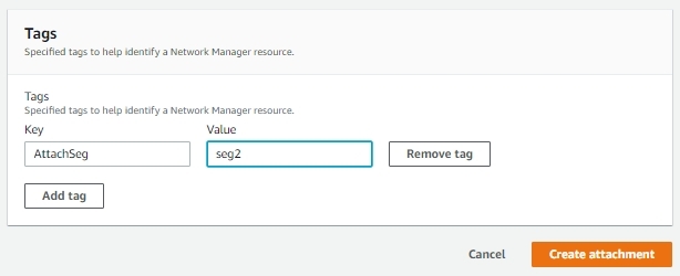 Tag에 Key와 Value를 Attachment Policy에서 지정했던 AttachSeg(Key), seg2(Value)로 설정하고, Attachment를 생성합니다.
