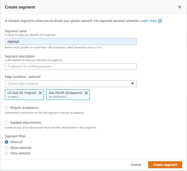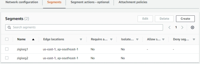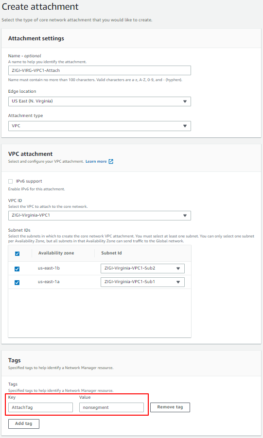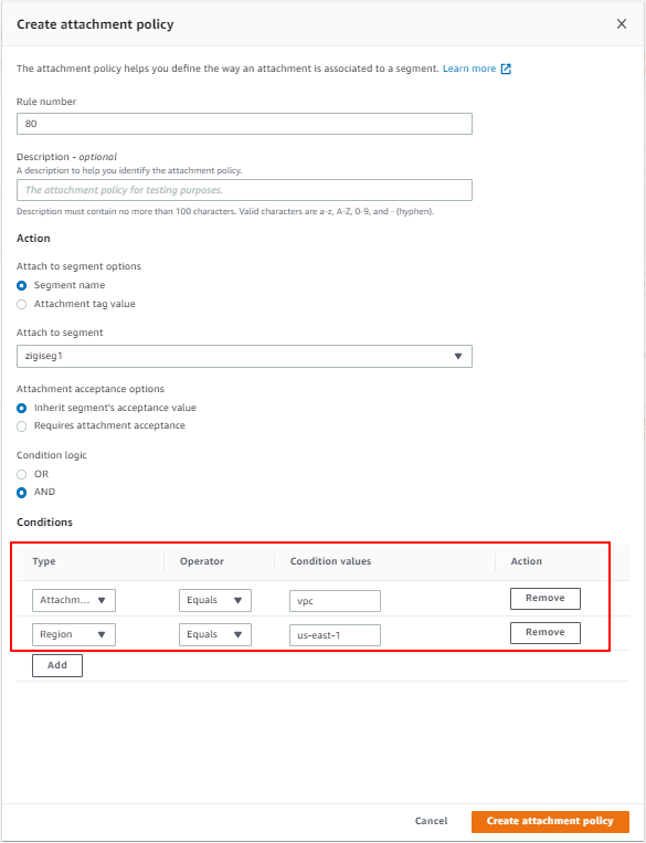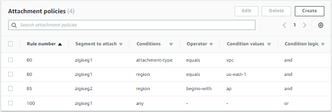 Attachment Type이 VPC이면서, Region이 us-east-1(Virginia)인 경우에 zigiseg1 Segment에 할당합니다.