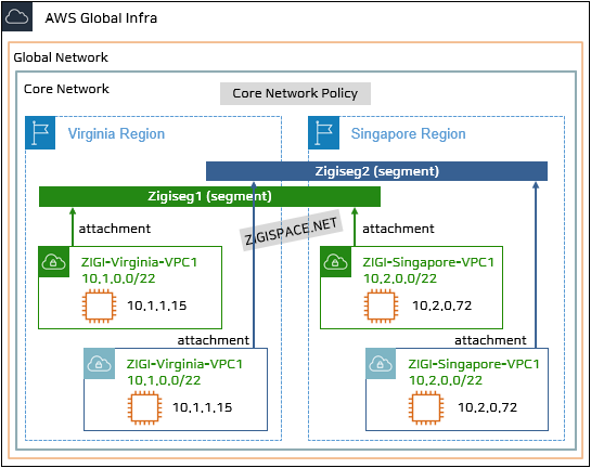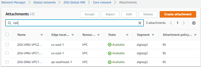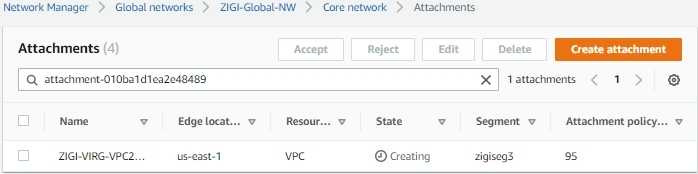 새롭게 생성한, ZIGI-VIRG-VPC2-Attach가 95번 Attachment Policy에 적용되어, zigiseg3 Segment로 연결되었습니다.