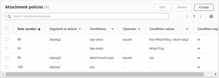 90번 Attachment Policy 조건에 해당하지 않기 때문에 기존과 동일한 100번 조건에 따라 zigiseg1 Segment로 할당됩니다.