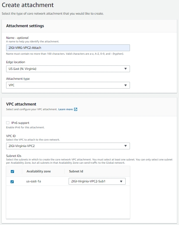 ZIGI-VIRG-VPC2-Attach라는 이름의 VPC Attachment를 생성합니다.