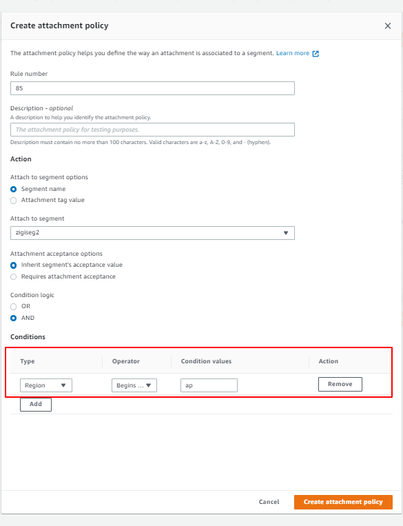 이번 Attachment Policy는 Conditions을 2개로 설정하고, And 조건으로 설정합니다.