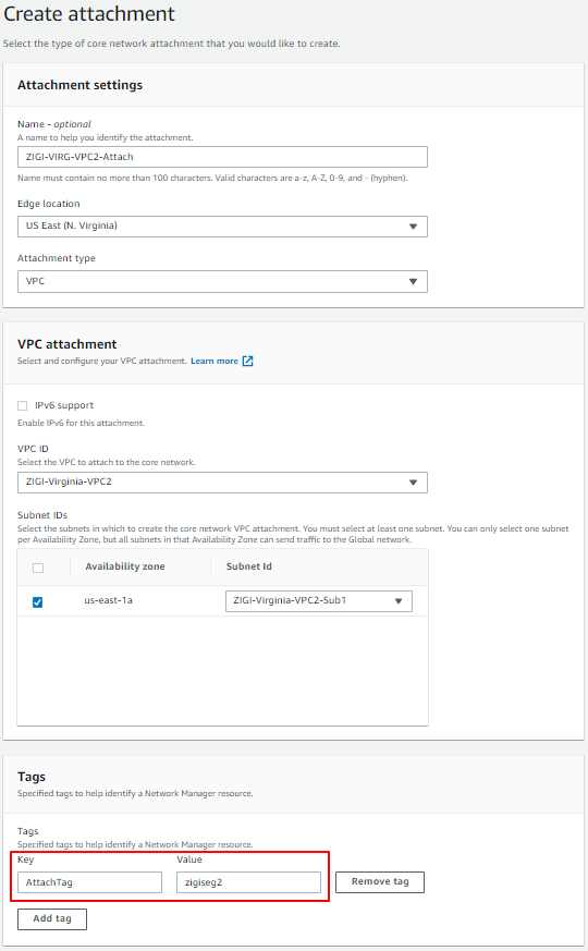 'AttachTag' Tag Key에 대한 테스트를 위해서 ZIGI-VIRG-VPC-Attach라는 이름으로 Attachment를 추가로 만듭니다.