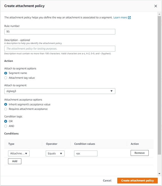 이번에는 Attachment Type이 VPC인 경우에 zigiseg3이라는 Segment로 연결되도록 95번 Rule을 만듭니다.