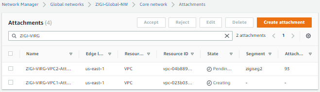 ZIGI-VIRG-VPC2-Attach라는 이름의 VPC Attachment를 생성합니다.