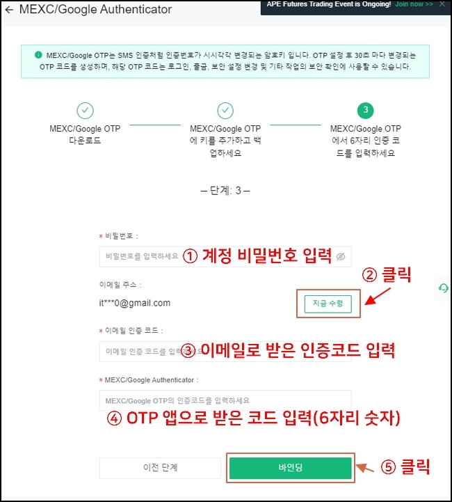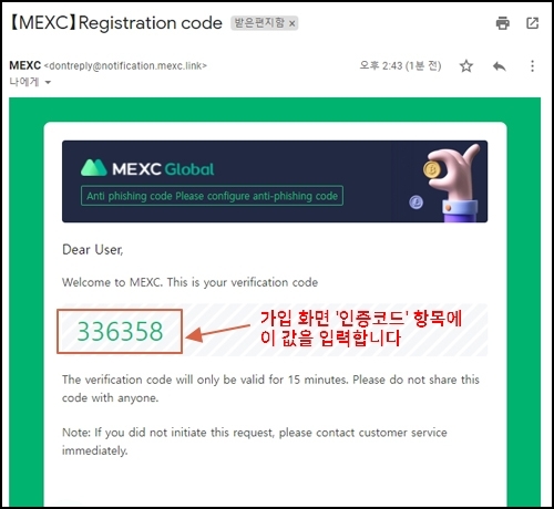 ID로 사용할 이메일로 MEXC 거래소 가입을 위한 인증 코드인 6자리 숫자가 메일로 옵니다.