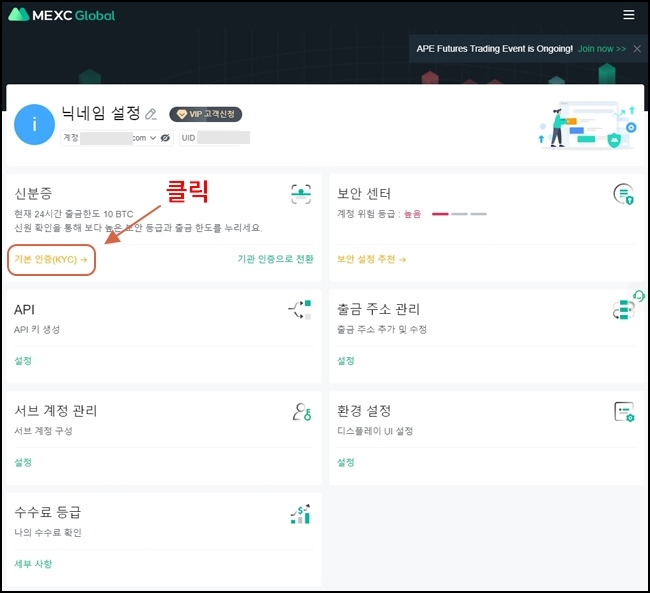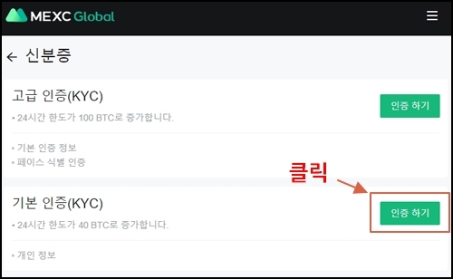 신분증 섹션에서 '기본 인증(KYC)'를 클릭합니다.