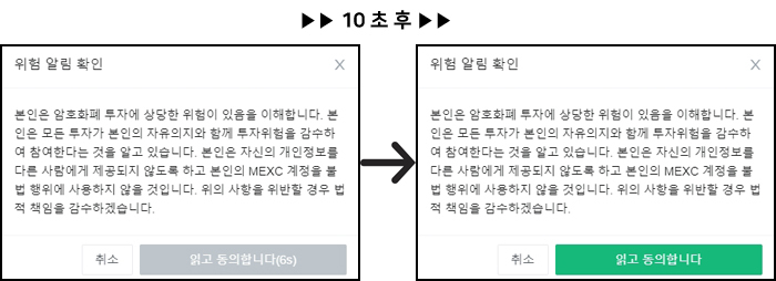 10초 후에 '읽고 동의합니다' 버튼이 활성화 됩니다.