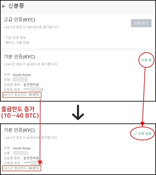출금한도도 10 → 40 BTC로 상향된 것을 볼 수 있습니다.