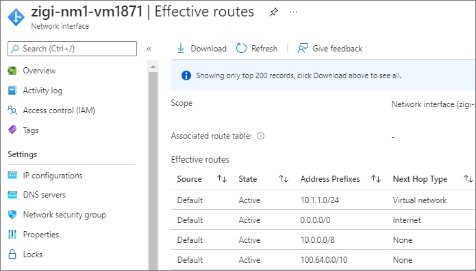 테스트를 진행한, IP 주소 10.1.1.4를 가신 VM의 네트워크 인터페이스에서 유효 경로를 확인합니다.