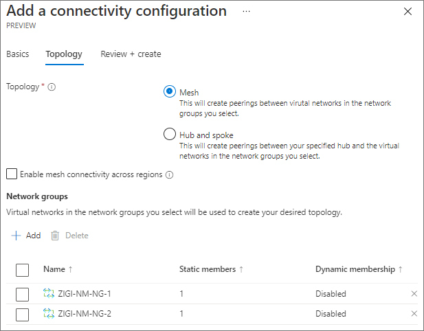 VNet 간의 연결을 위한 Connectivity configuration에서는