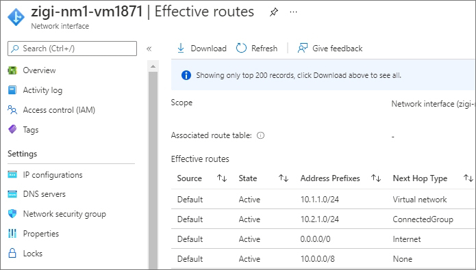 Network Manger로 연결된 VNet인 10.2.1.0/24 대역에 대한 라우팅이 ConnectedGroup이라는 Next Hop Type으로 설정된 것을 확인하실 수 있습니다.
