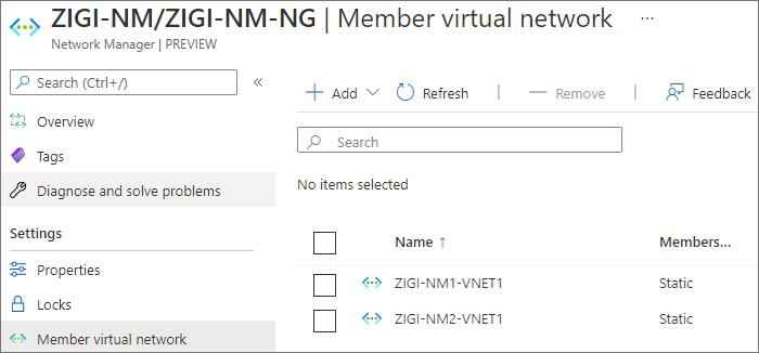 'ZIGI-NM-NG' 라는 Network Group에 2개의 VNET이 Static으로 연결되어 있습니다.