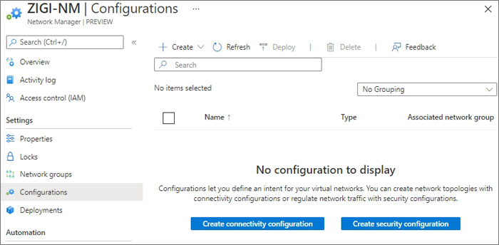 현재 Network Manager에서 정책 설정은 VNet 간의 연결을 위한 Connectivity Configuration 과 네트워크 보안을 위한 Security Configuration 이 있습니다.