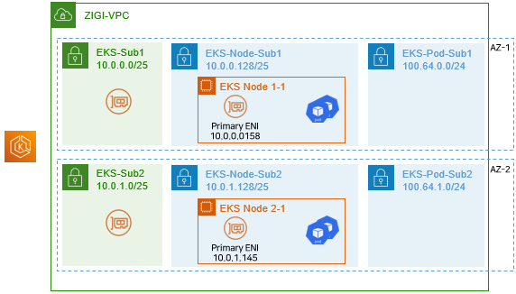 기존의 EKSNode1-1, EKSNode2-1은 초기에 구성된 10.0.0.128/25, 10.0.1.128/25 대역과 함께