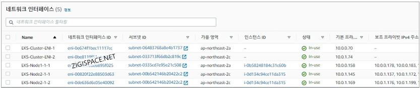 Worker Node 생성 시에 구성된 ENI (10.0.0.158, 10.0.1.145, 10.0.1.169) 가 있는 것을 볼 수 있습니다.