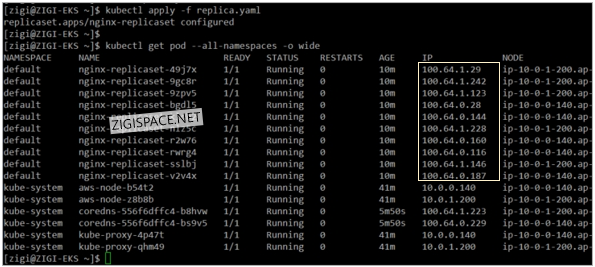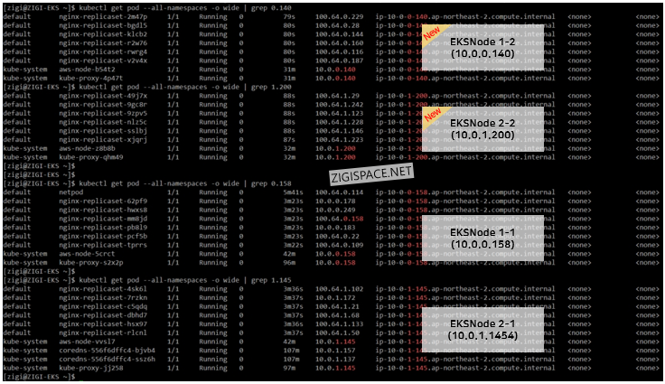 신규로 배포된 EKSNode1-2, EKSNode2-2에서는 100.64.X.X 대역으로 pod가 배포된 것을 볼 수 있고