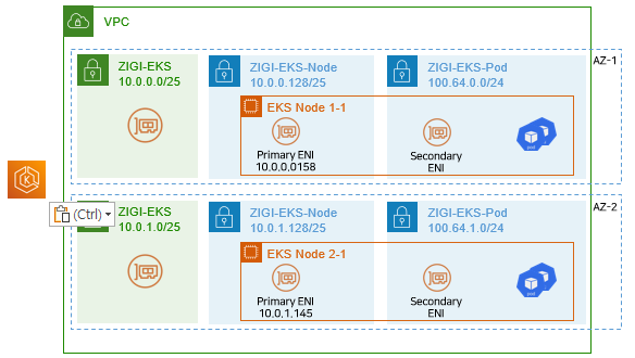 EKS Node는 EKS-Node-Sub1과 EKS-Node-Sub2라는 서브넷에 구성되어 있습니다.