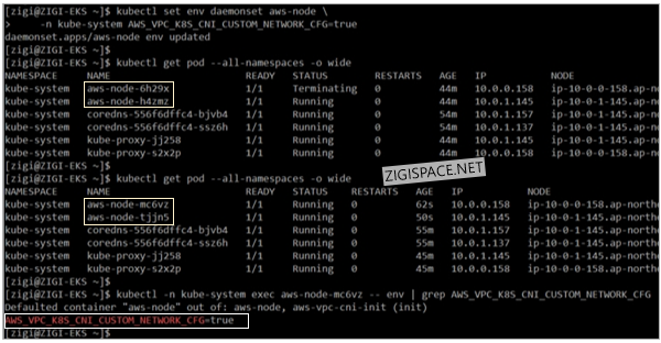 기존의 aws-node pod가 변경된 환경 변수 값을 가진 pod로 교체 되는 것을 아래와 같이 볼 수 있습니다.