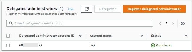 Delegated administrator에도 방금 전에 권한을 추가한 Account ID가 등록(Regsitered)된 것을 볼 수 있습니다.