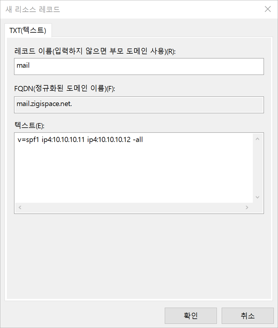 도메인에 SPF 레코드를 작성하려면 TXT 레코드를 사용합니다. TXT 레코드로 화이트 도메인으 로 설정하려는 IP 주소를 다음과 같이 작성합니다.