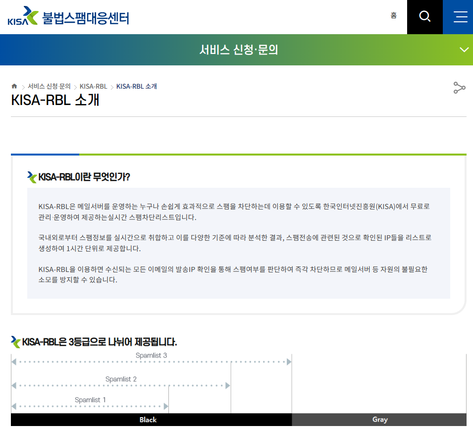 한국인터넷진흥원(KISA)에서는 불법적인 방법으로 발송되는 스맴메일 차단활동을 하고 있습니다. 이를 위해 정상적인 도메인을 인증,관리하는 제도가 ‘화이트 도메인’입니다. 반대로 불법적인 스 펌메일을 발송하는 사이트를 실시간 블랙리스트 정보로 관리해 메일 발송을 제한합니다. 이 실시 간 블랙 리스트를 RBL(Realtime Blackhole List, Realtime Blocking List) 이 라고 합니다.