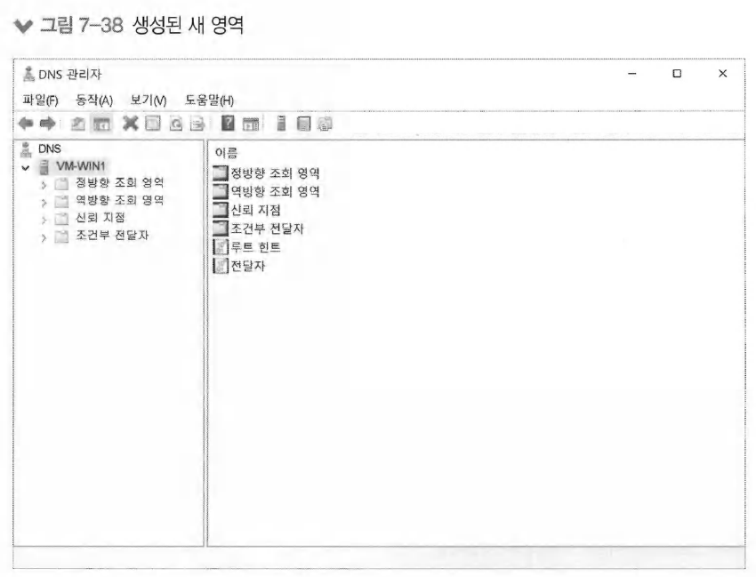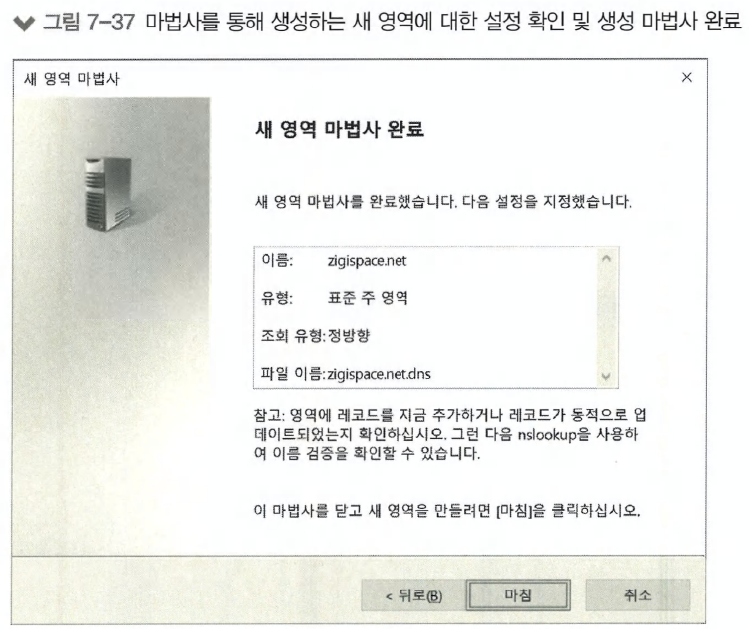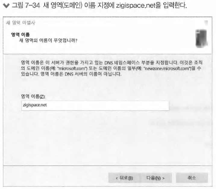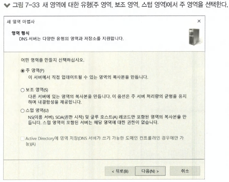 이제 새로운 도메인 영역을 생성해보겠습니다. 서비스를 운영하기 위해 외부에 광고할수 있는 도 메인을 구입해야 하지만 단순히 테스트용으로 내부에서만 사용한다면 도메인을 구매하지 않고 임 의로 도메인을 만들어 테스트할 수 있습니다. 정방향 조회 영역에서 마우스를 우클릭해 팝업 메뉴 를 띄읍니다. 팝업 메뉴에서 “새 영역”을 선택하면 그림 7-32와 같이 새 영역 마법사가 실행됩니 다. ‘다음’ 버튼을 눌러 마법사를 진행합니다.