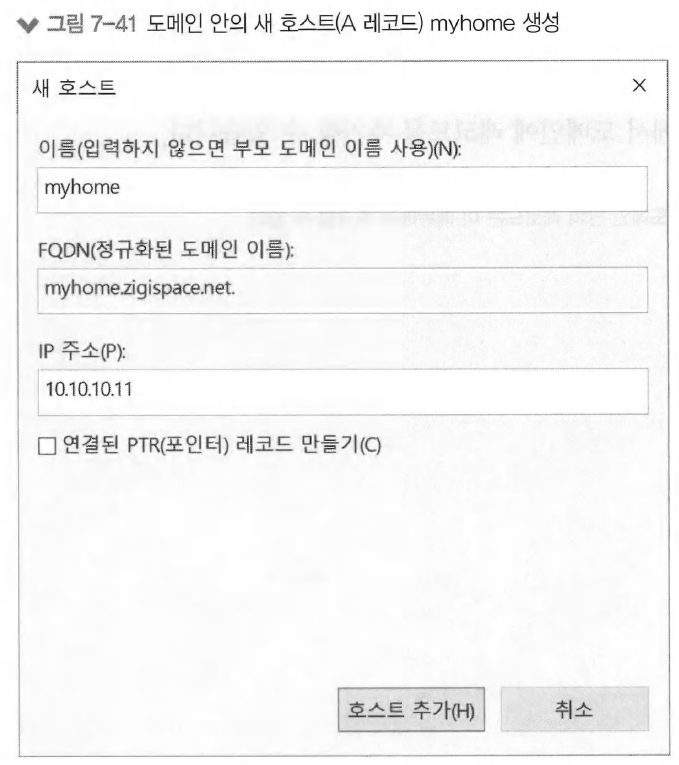 기본적으로 많이 사용되는 A 레코드(IPv4),AAAA 레코드(IPv6),CNAME 레코드,MX 레코드 는 바로 선택할 수 있습니다. 다른 새 레코드를 선택하면 4가지 주요 레코드 외에 다양한 레코드 를 선택할 수 있습니다. 여기서는 가장 많이 사용되는 A 레코드를 만들어보겠습니다. 만들 이름 을 입력하면 하단에 “입력한 레코드명+도메인 이름,’으로 FQDN이 자동으로 표기됩니다. 그 아 래에는 레코드 질의에 답변할 IP 주소를 설정합니다. 여기서 이름을 아예 입력하지 않으면 도메인 영역,그 자체를 의미하게 됩니다. 즉,zigispace.net 도메인에 호스트 이름을 입력하지 않으면 zigispace.net 자체를 의미합니다. 여기서는 myhome이라는 A 레코드를 생성하고 해당 레코드 에 응답할 IP 주소로 10.10.10.11 을 입력했습니다. 입력한 후 ‘호스트 추가’ 버튼을 클릭하면 레 코드가 생성됩니다.