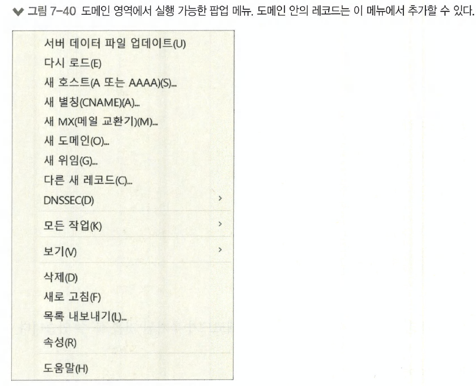 새 도메인 영역까지 만들어졌으니 새 레코드를 만들어보겠습니다. 새 레코드는 해당 도메인 영역 에서 ‘우클릭’해 만들 수 있습니다. 우클릭하면 그림 7-40과 같이 도메인 영역에서 실행 가능한 다양한 메뉴가 팝업으로 듭니다. 이 메뉴에서 도메 인에 레코드를 추가할 수 있습니 다.