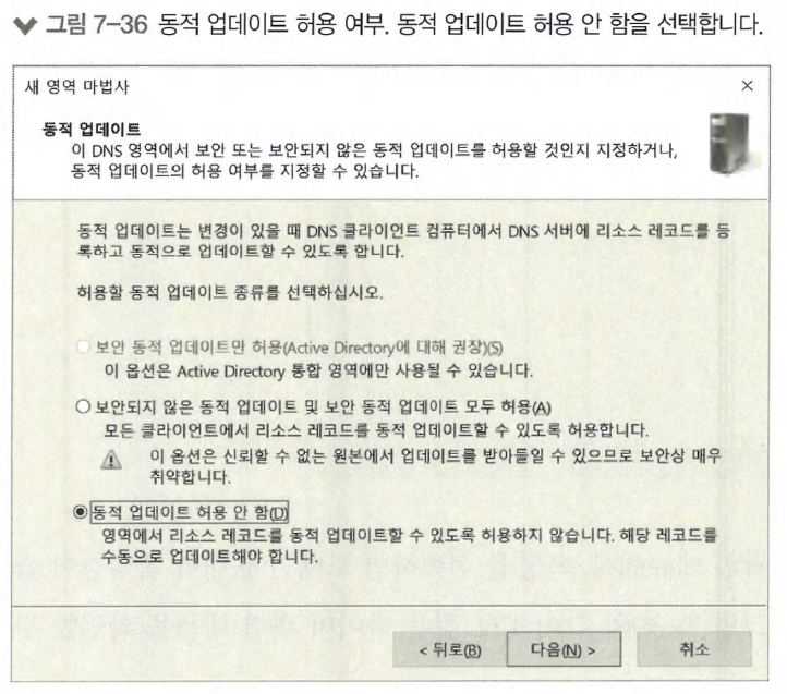 다음 버튼을 클릭하면 동적 업데이트 여부를 묻습니다. 동적 업데이트는 변경이 있을 때,DNS 클 라이언트 컴퓨터에서 DNS 서버에 리소스 레코드를 등록하고 동적으로 업데이트하도록 하는 기 능입니다. 여기서는 [동적 업데이트 허용 안 함]을 선택하고 ‘다음’ 버튼을 클릭합니다.