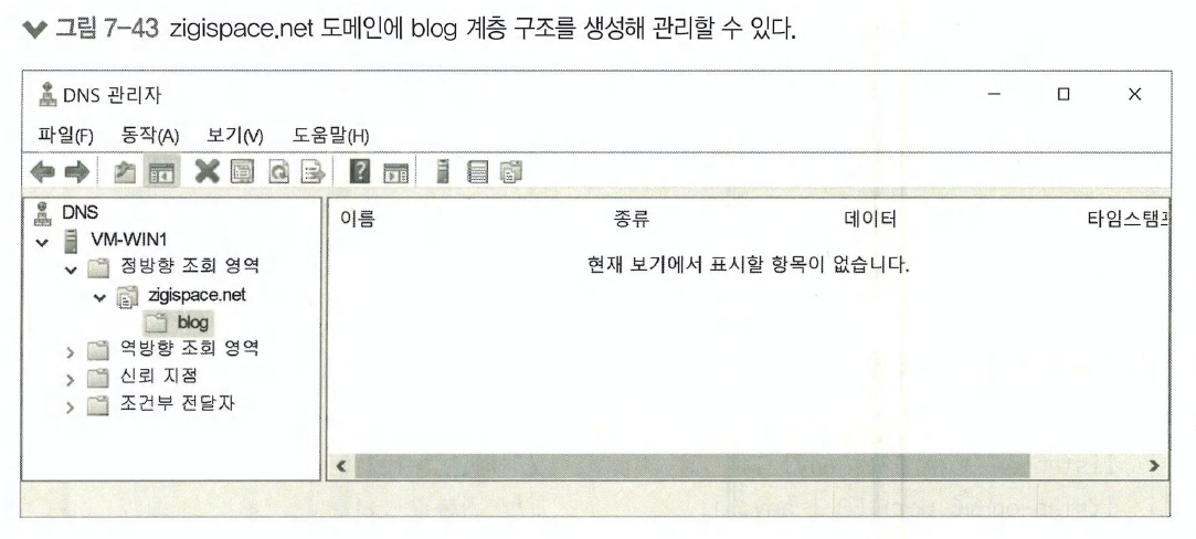 도메 인은 계층 구조로 운영 되므로 현재 계층에 하부 도메 인 계층을 추가할 수 있습니 다. 하부 도 메인을 구성하려면 도메인 영역 안에서 새로운 레코드를 만들었던 팝업 창에서 ‘새 도메인’을 선 택하고 이름을 만들면 추가 계층으로 도메인이 만들어집니다. zigispace.net 도메인 영 역에서 새 도메인을 선택해 blog라고 추가 구성하면 다음과 같이 계층적인 도메인을 구성할 수 있습니다. 이때 blog.zigispace.net 호스트를 구성한 것이 아니라 rn.blog.zigispace.net과 같이 blog 도 메인이 하부에 생기고 그 도메인에 새로운 호스트들이 구성되는 구조가 만들어집니다.