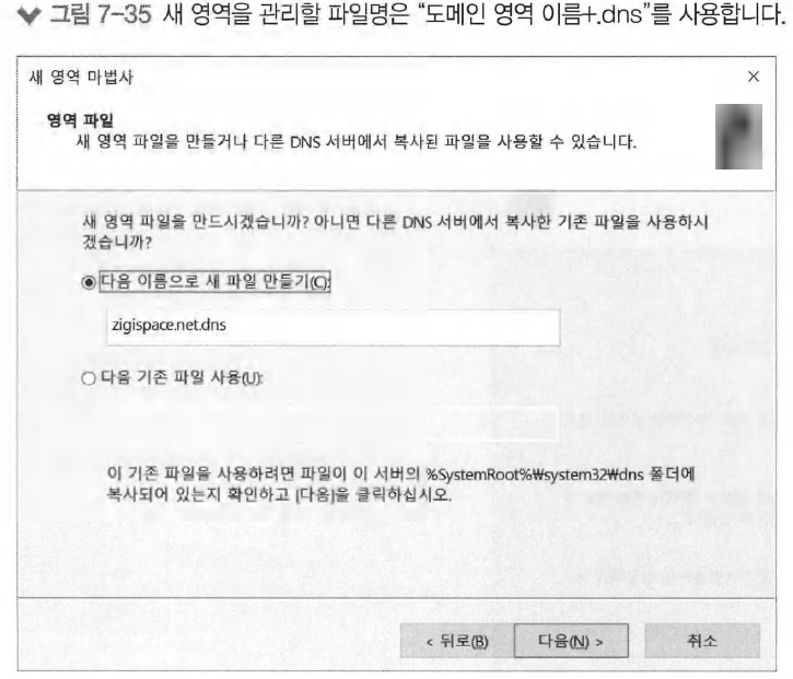 해당 도메인 영역의 내용이 관리될 파일을 지정합니다. 도메인 영역 파일은 “도메인 영역 이름 +.dns” 이름으로 관리합니다. 이 파일은 DNS 서버를 다른 서버로 이전할 때도 사용됩니다. 예제 에서는 도메인이 ‘zigispace.net’이므로 도메인 영역 파일명은 ‘zigispace.net.dns,로 사용합니 다. 파일명을 입력한 후 ‘다음’ 버튼을 누릅니다.