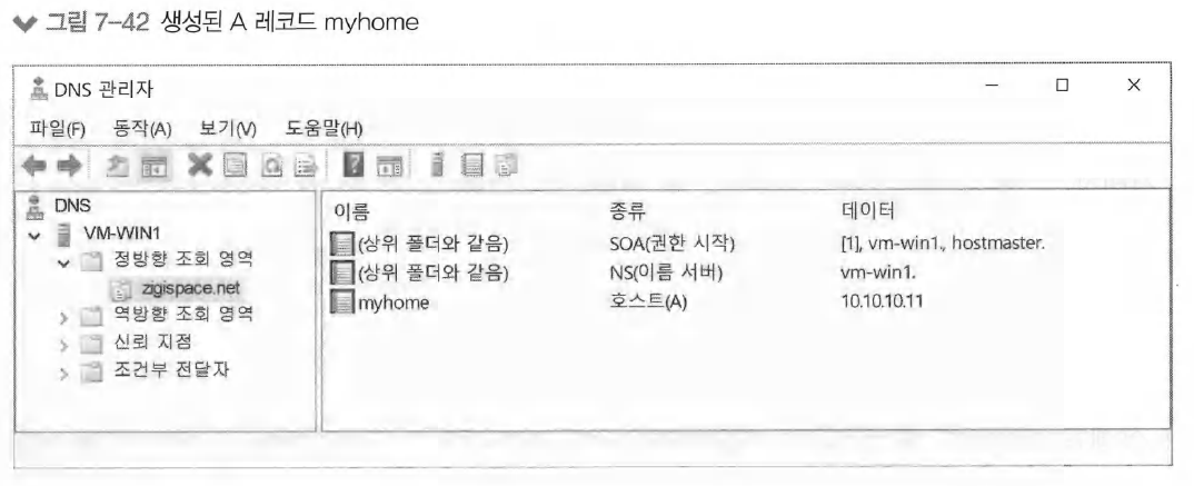 DNS 서버 기능을 추가하면 DNS 관리자 항목이 생깁니다. 실행창[Windows키+R]에서 dnsmgmt.msc를 입력해 DNS 관리자를 실행합니다. DNS 관리자에는 정방향 조회 영역,역방 향 조회 영역신뢰 지점,조건부 전달자 항목이 있습니다. 실제로 앞에서 알아본 레코드를 포함해 대부분의 레코드는 정방향 조회 영역에서 설정이 필요합니다.