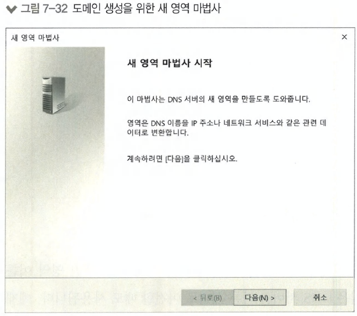 이제 새로운 도메인 영역을 생성해보겠습니다. 서비스를 운영하기 위해 외부에 광고할수 있는 도 메인을 구입해야 하지만 단순히 테스트용으로 내부에서만 사용한다면 도메인을 구매하지 않고 임 의로 도메인을 만들어 테스트할 수 있습니다. 정방향 조회 영역에서 마우스를 우클릭해 팝업 메뉴 를 띄읍니다. 팝업 메뉴에서 “새 영역”을 선택하면 그림 7-32와 같이 새 영역 마법사가 실행됩니 다. ‘다음’ 버튼을 눌러 마법사를 진행합니다.