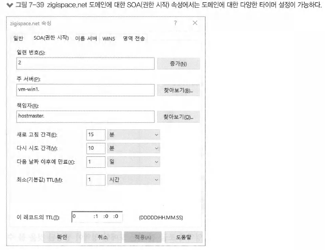도메인 명에서 마우스를 우클릭한 후 팝업 메뉴에서 ‘속성’을 선택하면 도메인에 대한 속성창이 듭 니다. 속성창 안의 기본 SOA 탭에서 그림 7-39와 같이 TTL 같은 타이머 관련 내용을 확인할 수 있습니다.