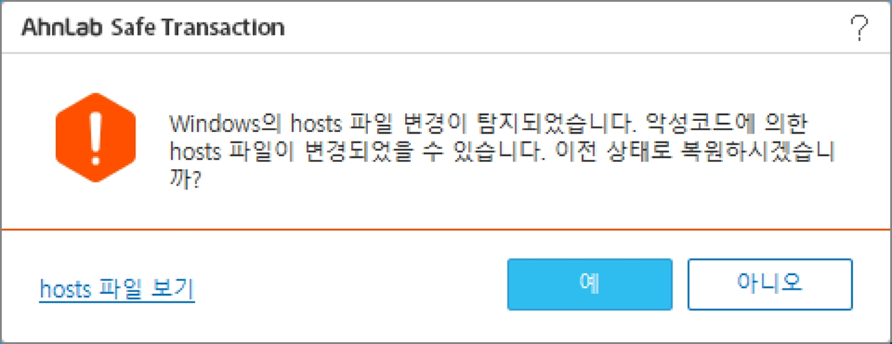 또한,이 hosts 파일을 임의로 조작해 정상적인 사이트가 아니라 사용자의 정보를 빼내기 위한 유 해 사이트로 접근을 유도할 때도 있습니다. 원래 이런 사이트는 사용자가 접속하려는 사이트의 디 자인과 동일하게 구성하고 도메인도 원래 도메인 그대로 사용해 접속한 것처럼 보여 매우 위험합 니다. 그래서 보안 프로그램에서 “hosts 파일이 변경되었습니다.”라는 경고 팝업창이 가끔 뜨는데 hosts 파일이 임의로 변경될 때 이런 보안 위험을 경고하는 것입니다. 금융 사이트 이용 시 그림 7-44와 같은 팝업창이 그 경우입니다.