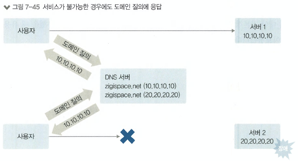 DNS에서 동일한 레코드 이름으로 서로 다른 IP 주소를 동시에 설정할 수 있습니다. 이렇게 설정 하면 도메인 질의에 따라 응답받는 IP 주소를 나누어 로드밸런싱할 수 있습니다. 이것을 DNS 로 드밸런싱이라고 합니다. 하지만 DNS만 이용한 로드밸런싱으로는 정상적인 서비스를 할 수 없습 니다. DNS는 설정된 서비스 상태의 정상 여부를 확인하지 않고 도메인에 대한 질의에 대해 설정 된 값을 무조건 응답합니다. DNS에 저장된 레코드와 매핑된 서비스가 모두 정상일 때는 문제가 없지만 그림 7-45처럼 특정 서비스(서버 2)에 문제가 있을 때 DNS 서버는 이것을 감지하지 못해 사용자의 도메인 질의 요청에 비정상 상태인 서비스 IP 주소를 응답한 경우,사용자는 해당 서비 스에 접근할 수 없습니다. 즉,DNS 서버에서는 각 레코드에 대한 서비스 체크가 이루어지지 않고 설정된 값에 따라 동작하므로 서비스 가용성 향상 방법으로는 부적합합니다.